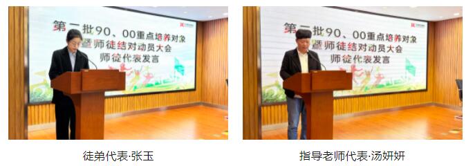 随后,师徒代表上台发言。指导老师代表汤妍妍分享自己的结对过程及心得体会,表示在培养过程要做好“传帮带”工作,要互相学习、相互促进、取长补短,和徒弟一起同进步、共成长。徒弟代表张玉表示将珍惜此次机会,主动学习、虚心求教,不断钻研专业知识,提升专业技能,勤学苦干、奋勇担当,为集团发展添砖加瓦。