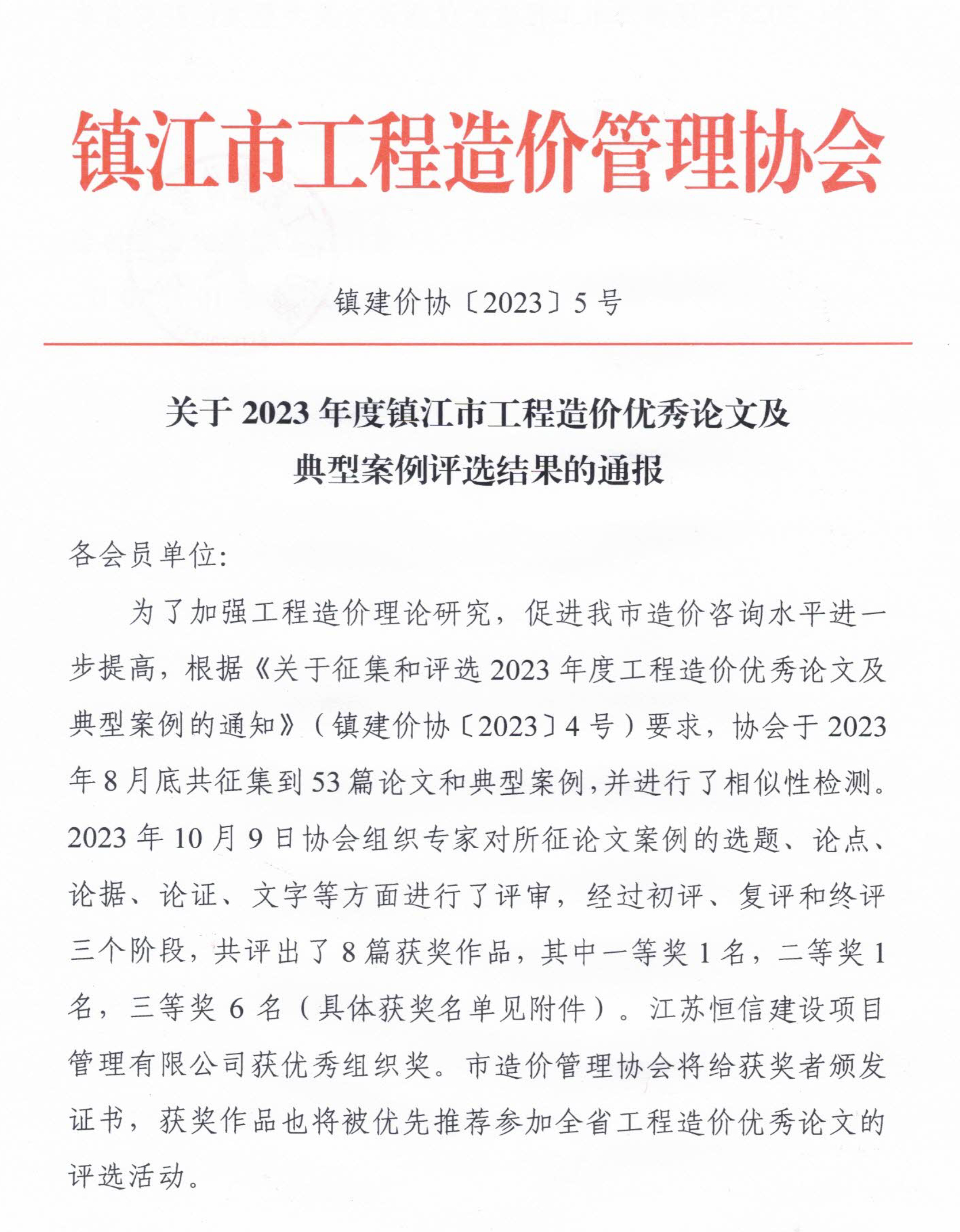 在2023年度镇江市工程造价优秀论文及典型案例评选中,江苏恒信建设项目管理有限公司荣获多项殊荣: