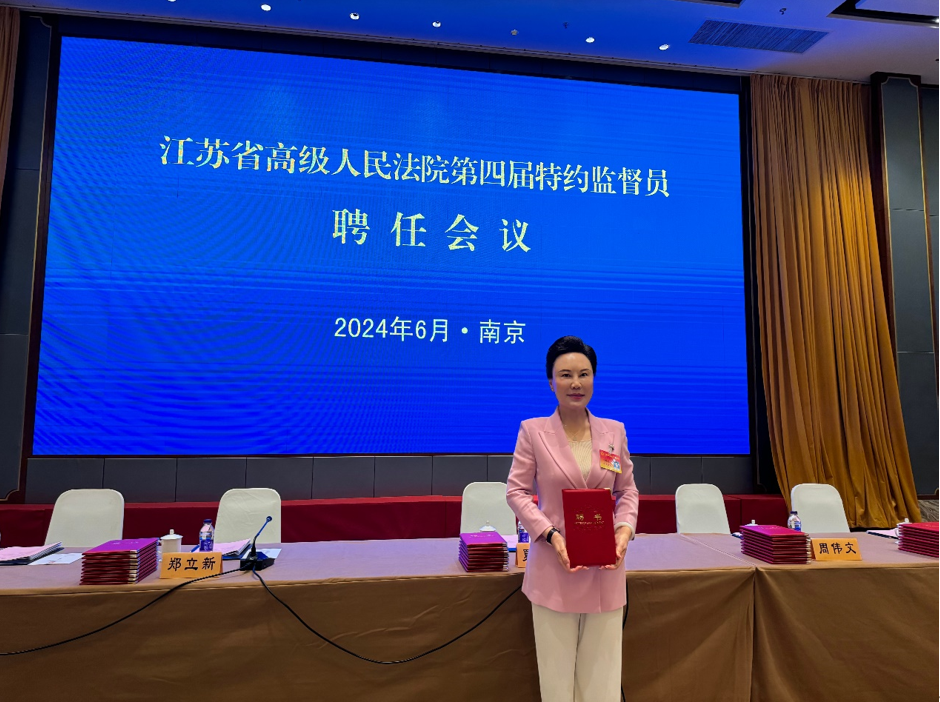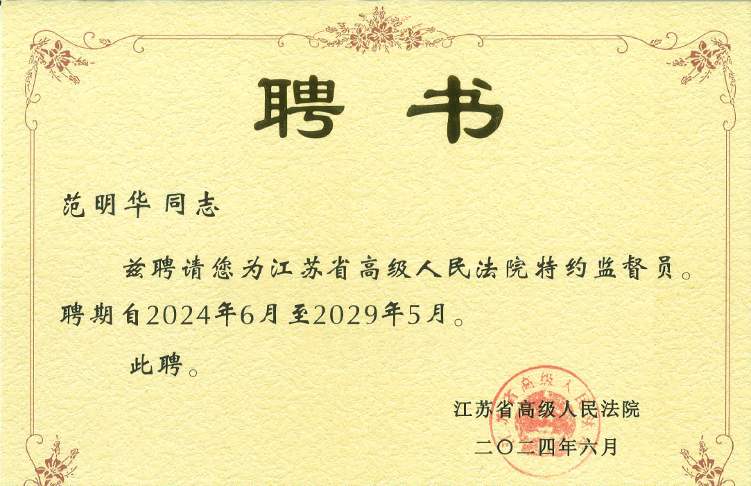 2024年6月21日上午,江苏省高级人民法院召开第四届特约监督员聘任会议。集团党委书记、理事长范明华受聘为第四届特约监督员。