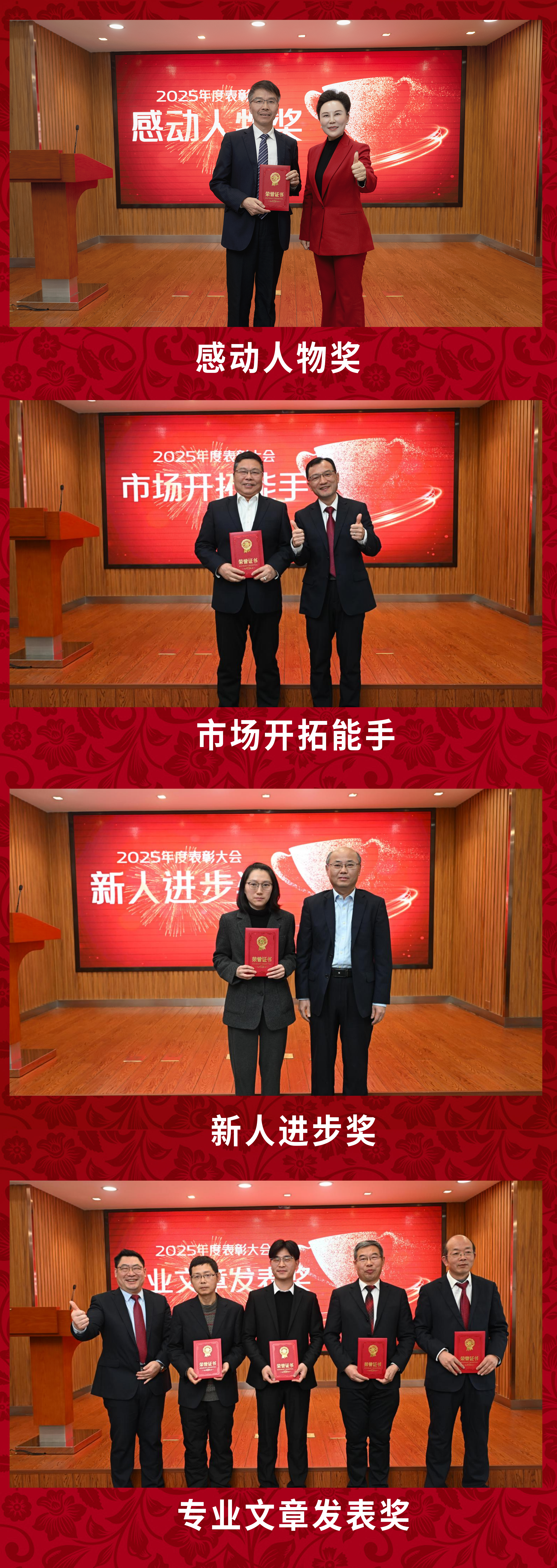 表彰环节,大会对年度工作中表现突出的先进个人予以表彰,授予“感动人物奖”“新人进步奖”“市场开拓能手”“专业文章发表奖”等荣誉称号。此次表彰不仅是对优秀员工的肯定,更树立起“比学赶超”的鲜明导向,进一步凝聚了团队的奋进合力。