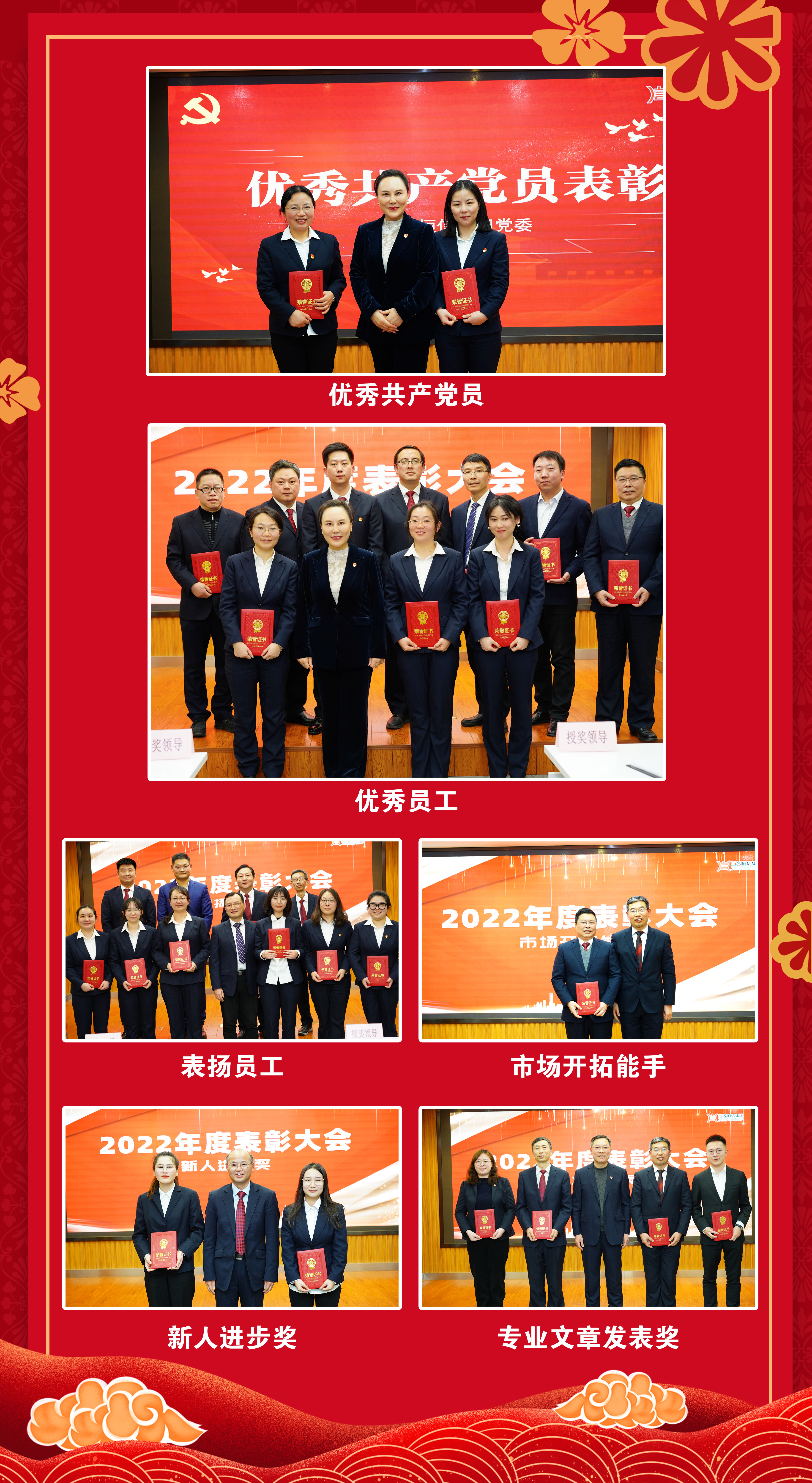 会上表彰了优秀共产党员、优秀员工、表扬员工、市场开拓能手、新人进步奖、专业文章发表奖等荣誉获得者。集团领导班子为受表彰员工颁奖并希望他们谦虚谨慎、戒骄戒躁、再接再厉、再创佳绩。