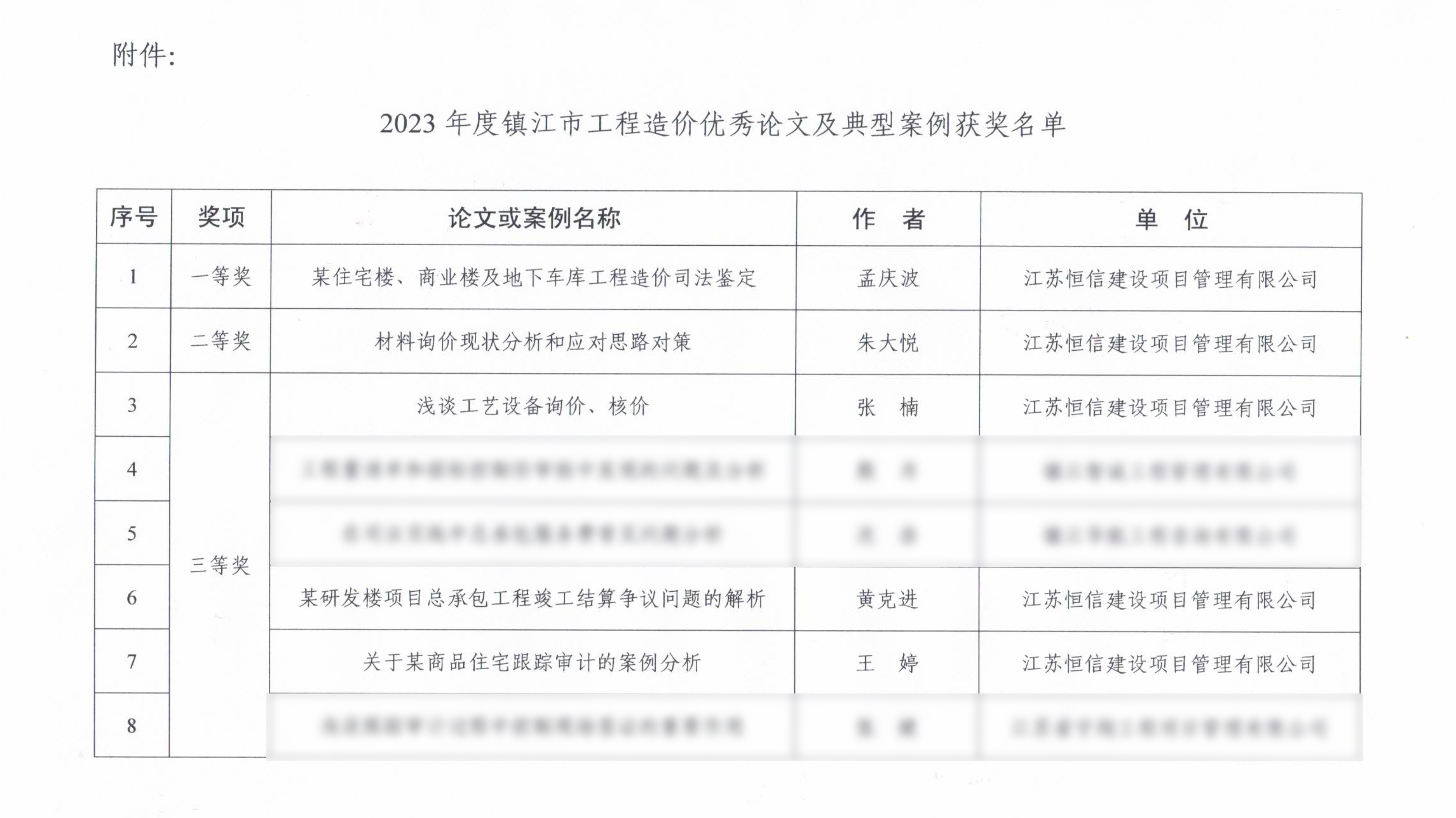 在2023年度镇江市工程造价优秀论文及典型案例评选中,江苏恒信建设项目管理有限公司荣获多项殊荣: