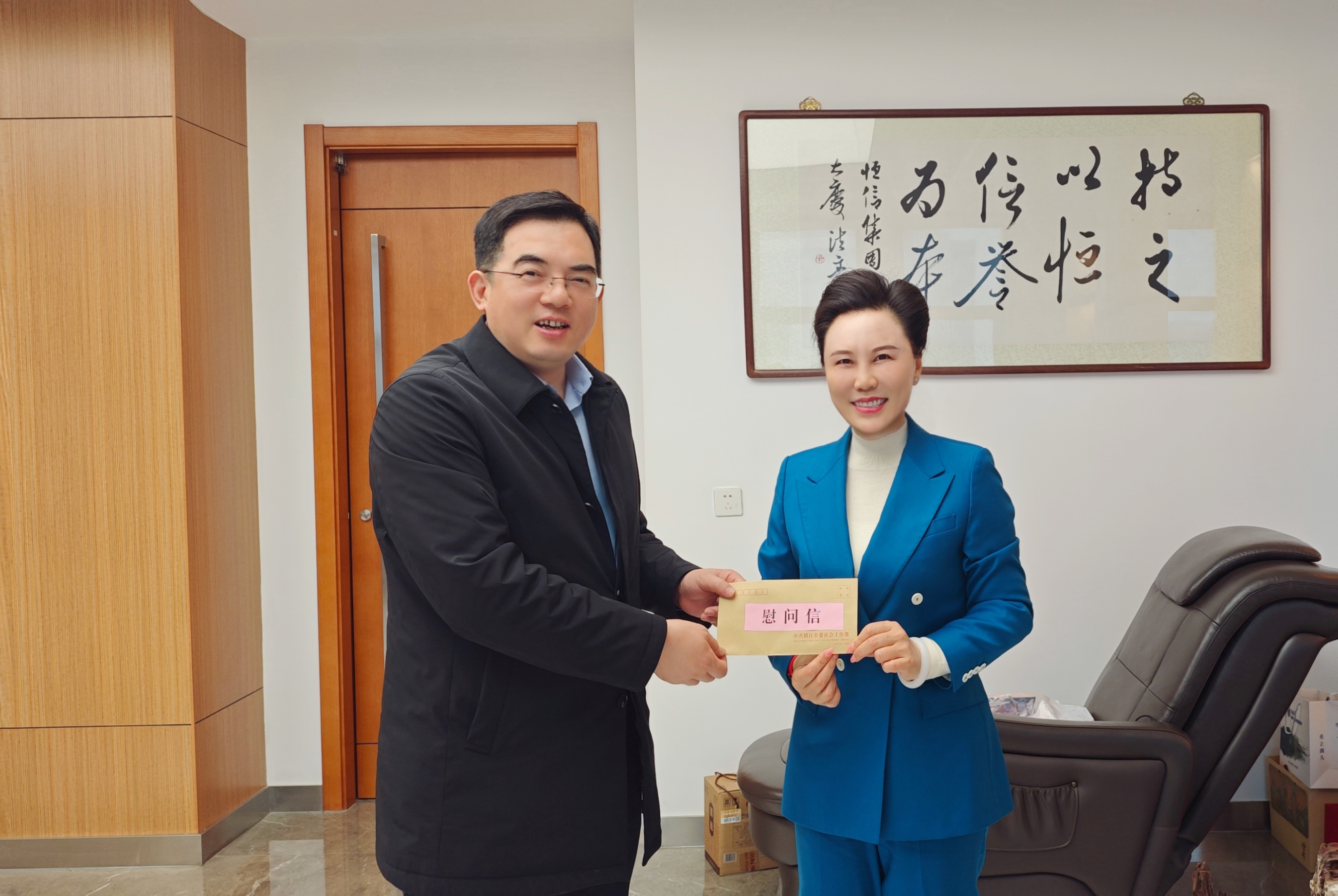 2025年1月23日,镇江市社会工作部部长顾明华一行莅临集团开展新春慰问,集团党委书记、理事长范明华热情接待。