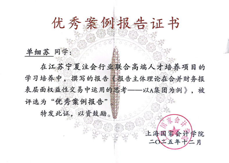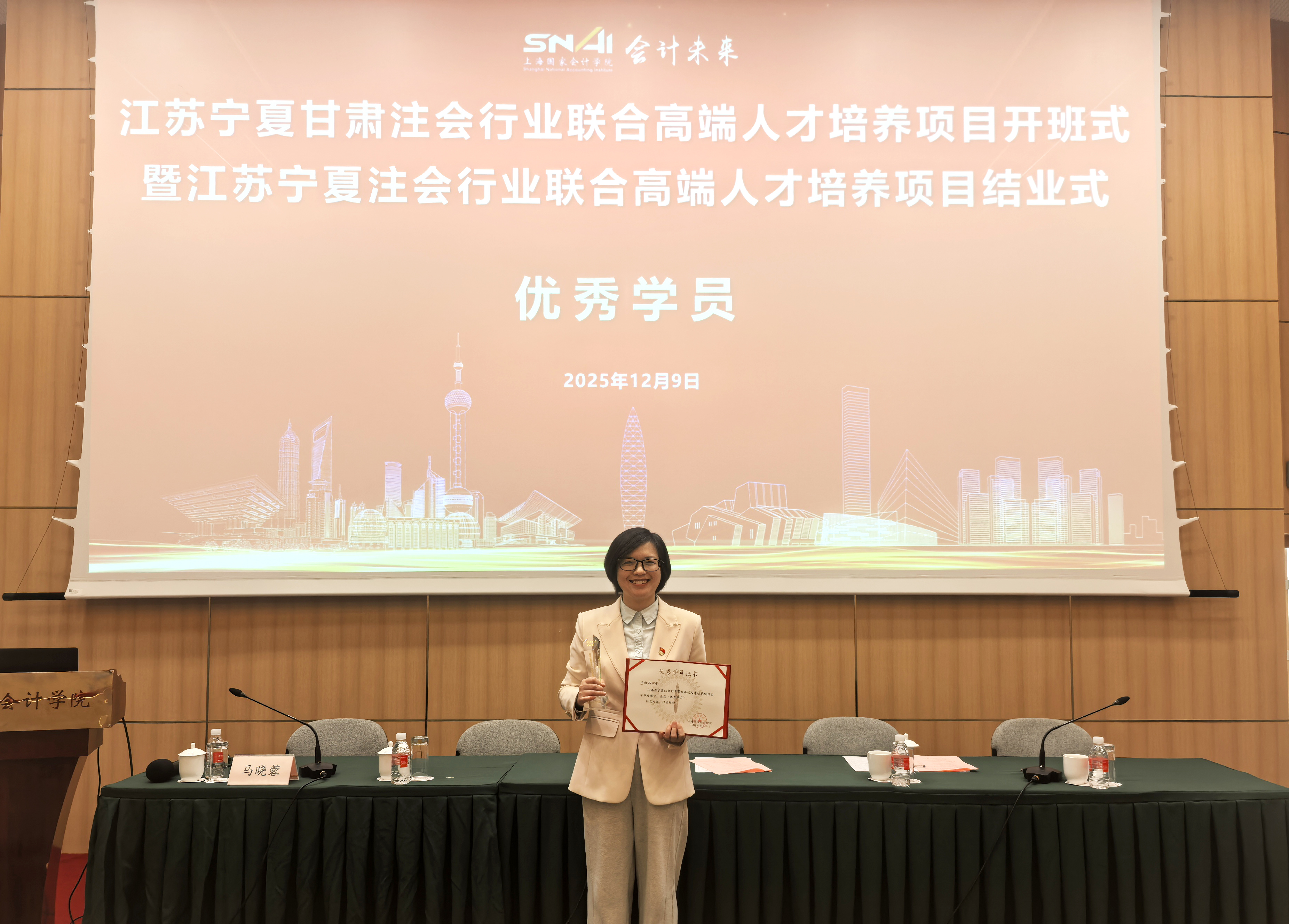 近日,“江苏宁夏注会行业联合高端人才培养项目结业式”在上海国家会计学院隆重举行,我所单细苏同志圆满完成所有培养课程,经考核通过,顺利结业,并获评“优秀学员”称号。此外,在培养过程中,该同志撰写的《报告主体理论在合并财务报表层面权益性交易中运用的思考——以A集团为例》被评为“优秀案例报告”。